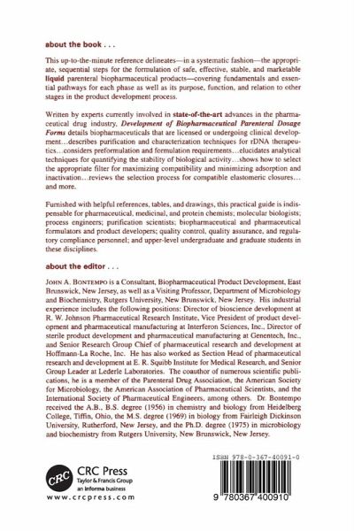 This up-to-the-minute reference delineates-in a systematic fashion-the appropriate, sequential steps for the formulation of safe, effective, stable, and marketable liquid parenteral biopharmaceutical products-covering fundamentals and essential pathways for each phase as well as its purpose, function, and relation to other stages in the product development process. Written by experts currently involved in state-of-the-art advances in the pharmaceutical drug industry, Development of Biopharmaceutical Parenteral Dosage Forms details biopharmaceuticals that are licensed or undergoing clinical development, including genetically engineered cell and engineered vectors in the fermentation process describes purification and characterization techniques for rDNA therapeutics, discussing several types of unit operations for isolation, purification, and characterization considers preformulation and formulation requirements, such as physicochemical properties, drug delivery, stability studies programs, deactivation/denaturation routes, selection of compatible excipients, and regulatory compliance elucidates basics of analytical techniques, methods development, separation methods using chromatographic and electrophoretic techniques, and bioactivity methods covering bioassays and immunoassays for quantifying the stability of biological activity shows how to select the appropriate filter for maximizing compatibility and minimizing adsorption and inactivation, examining topics from basic filtration theories to future trends reviews the selection process for compatible elastomeric closures, analyzing physical, chemical, toxicological properties, protein adsorption on elastomeric surfaces, strategies to reduce/eliminate adsorption, and specialized containers for biotechnological applications and more! Furnished with helpful references, tables, and drawings, this practical guide is indispensable