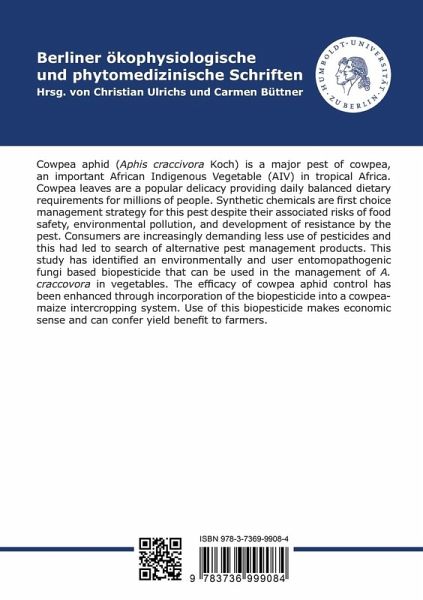 Beschreibung Cowpea aphid (Aphis craccivora Koch) is a major pest of cowpea, an important African Indigenous Vegetable (AIV) in tropical Africa. Cowpea leaves are a popular delicacy providing daily balanced dietary requirements for millions of people. Synthetic chemicals are first choice management strategy for this pest despite their associated risks of food safety, environmental pollution, and development of resistance by the pest. Consumers are increasingly demanding less use of pesticides and this had led to search of alternative pest management products. This study has identified an environmentally and user entomopathogenic fungi based biopesticide that can be used in the management of A. craccovora in vegetables. The efficacy of cowpea aphid control has been enhanced through incorporation of the biopesticide into a cowpea-maize intercropping system. Use of this biopesticide makes economic sense and can confer yield benefit to farm