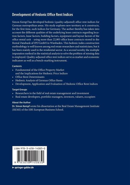 Simon Kempf has developed hedonic (quality-adjusted) office rent indices for German metropolitan areas. His study explores new territory as it constructs, for the first time, such indices for Germany. The author thereby has taken into account the different qualities of the underlying lease contracts regarding location factors, lease factors, building factors, equipment and layout factors of the office rental unit - using more than 22,005 office lease contracts stored in the Rental Databank of IPD GmbH in Wiesbaden. This hedonic index construction methodology is well known among real estate researchers and statisticians, but it has been mainly used in the residential sector. As a second novelty the multiple imputation method in the statistical analysis to solve the problem of missing data is employed. Quality-adjusted office rent indices serve as market and economic indicators as well as a bench-marking instrument.