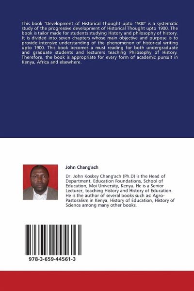 This book "Development of Historical Thought upto 1900" is a systematic study of the progressive development of Historical Thought upto 1900. The book is tailor made for students studying History and philosophy of history. It is divided into seven chapters whose main objective and purpose is to provide intensive understanding of the phenomenon of historical writing upto 1900. This book becomes a must reading for both undergraduate and graduate students and lecturers teaching Philosophy of History. Therefore, the book is appropriate for every form of academic pursuit in Kenya, Africa and elsewhere.