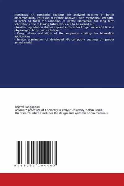 Numerous HA composite coatings are analyzed in-terms of better biocompatibility, corrosion resistance behavior, with mechanical strength. In order to fulfill the condition of better biomaterial for long term solicitations, the following future work are to be carried out, - In-vitro degradation studies implant surfaces for longer immersion time in physiological body fluids solutions.- Drug delivery evaluations of HA composites coatings for biomedical applications- In-vivo examination of developed HA composite coatings on proper animal model