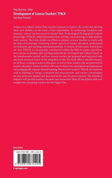Preface.- Part I TPACK in Teaching Practices.- Chapter 1 The development of teachers' professional learning and knowledge.- Chapter 2 The TPACK-P framework for science teachers in a practical teaching context.- Chapter 3 The current status of science teachers' TPACK in Taiwan from interview data.- Part II The Transformative Model of TPACK.- Chapter 4 Rubrics of TPACK-P for teaching science with ICTs.- Chapter 5.- Applying TPACK-P to a teacher education program.- Part III The Integrative Model of TPACK.- Chapter 6 Developing preservice teachers' sensitivity to the interplay between subject matter, pedagogy and ICTs.- Chapter 7 Examining teachers' TPACK in using e-learning resources in primary science lessons.- Part IV Epilogue.- Chapter 8 The end of the beginning: An epilogue.