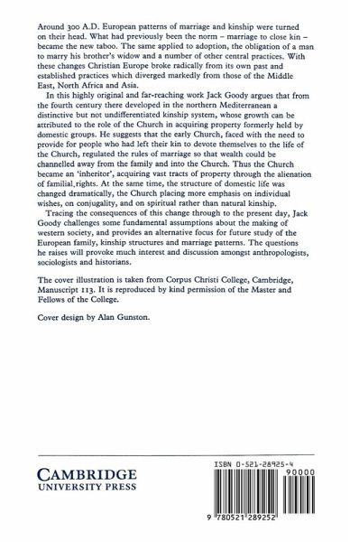 Around 300 A.D. European patterns of marriage and kinship were turned on their head. What had previously been the norm - marriage to close kin - became the new taboo. The same applied to adoption, the obligation of a man to marry his brother's widow and a number of other central practices. With these changes Christian Europe broke radically from its own past and established practices which diverged markedly from those of the Middle East, North Africa and Asia. In this highly original and far-reaching work Jack Goody argues that from the fourth century there developed in the northern Mediterranean a distinctive but not undifferentiated kinship system, whose growth can be attributed to the role of the Church in acquiring property formerly held by domestic groups. He suggests that the early Church, faced with the need to provide for people who had left their kin to devote themselves to the life of the Church, regulated the rules of marriage so that wealth could be channelled away from the family and into the Church. Thus the Church became an 'interitor', acquiring vast tracts of property through the alienation of familial rights. At the same time, the structure of domestic life was changed dramatically, the Church placing more emphasis on individual wishes, on conjugality, and on spiritual rather than natural kinship. Tracing the consequences of this change through to the present day, Jack Goody challenges some fundamental assumptions about the making of western society, and provides an alternative focus for future study of the European family, kinship structures and marriage patterns. The questions he raises will provoke much interest and discussion amongst anthropologists, sociologists and historians.