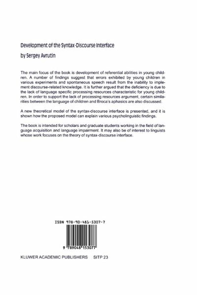 In this book, I address several issues of child linguistic development from the perspective of the syntax -discourse interface. Traditionally, language acquisition research has focused on the development of one of the linguistic modules, e.g. acquisition of syntax, morphology or phonology. While this approach can be viewed as fruitful in some cases, there is a number of linguistic phenomena whose explanation depends on the interaction of different modules and, therefore, different domains of linguistic knowledge. A typical example is pronominal anaphora: It can be shown that to correctly use pronominal elements, normal adult speakers must possess both syntactic and pragmatic knowledge, and that these kinds of knowledge must interact with each other. With regard to the language acquisition process, such phenomena suggest a somewhat different approach to the language acquisition research. Indeed, if some experimental studies show that children make errors in the construction under investigation, it will be necessary to consider these results from the point of view of the interaction of the different domains of linguistic knowledge involved in their interpretation. In other words, if this particular construction requires the integration of, for example, syntactic and discourse-based knowledge, children's errors may, in principle, be due to their lack of the former, the latter, or both kinds of knowledge, and cannot be taken as direct evidence for the "underdeveloped" status of just one of them.