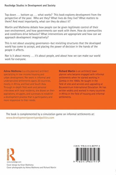 Top down . . . bottom up . . . what works? This book explores development from the perspective of the poor. Who are they? What lives do they live? What matters to them? And most importantly, what can they do about it? Martin and Mathema debate how people can be given legitimate control of their own environment, and how governments can work with them. How do communities and conditions drive behavior? What interventions are appropriate and how can we approach development imaginatively? This is not about usurping governance - but revisiting structures that the developed world has come to accept, and placing the power of decision in the hands of the people it affects. Nor it is about money . . . it's about people, and about how we can make our world work for everyone.