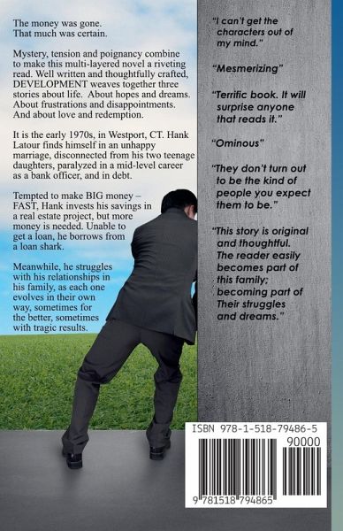 The first book in the author's Twisted Roads Series, It starts with a bang. The money was gone. That much was certain. Mystery, tension and poignancy combine to make this multi-layered novel a riveting read. Well written and thoughtfully crafted, DEVELOPMENT weaves together three stories about life. About hopes and dreams. About frustrations and disappointments. And about love and redemption. It is the early 1970s, in the affluent town of Westport, Connecticut. Hank Latour finds himself in an unhappy marriage, disconnected from his two teenage daughters, paralyzed in a mid-level career as a bank officer, and in debt. Tempted to make BIG money - FAST, Hank invests his savings in a new residential real estate development. But more money is needed. His bank is not willing to authorize a loan to the developers so Hank unexpectedly has the added burden to help deliver cash and momentum to this real estate project. Unable to find another source, he borrows the money from a loan shark. At the same time, Hank struggles with his relationships in his family, as each individual develops in their own way, sometimes for the better and sometimes with tragic results. This story is original and thoughtful. The reader easily becomes part of this family; becoming part of their struggles and dreams. The reality of their circumstances are just that, reality.