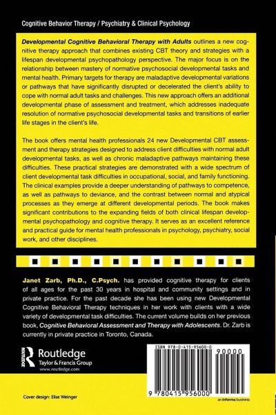 Developmental Cognitive Behavioral Therapy with Adults outlines a new cognitive approach that combines existing CBT theory and strategies with a lifespan developmental psychopathology perspective. The major focus is on the relationship between mastery of normative psycho-social developmental tasks and mental health. Primary targets for therapy are maladaptive developmental pathways that have significantly disrupted the client's ability to cope with normal adult tasks and challenges. The book builds on standard cognitive therapy models and techniques, while providing further assessment and therapy strategies to address patterns interfering with resolution of normative adult tasks and roles. It introduces several new developmental assessment and therapy strategies, designed to address client difficulties with normal adult developmental tasks and to identify longstanding maladaptive pathways maintaining these difficulties. The book offers a variety of psycho-social developmental task difficulties in occupational, social, and family functioning. The clinical examples provide a deeper understanding of pathways to competence, as well as pathways to deviance, and the contrast between normal and atypical processes as they emerge at different developmental periods.