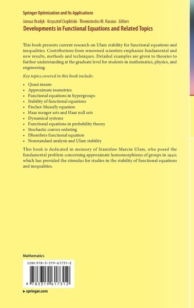 Quasi meansApproximate isometriesFunctional equations in hypergroupsStability of functional equationsFischer-Muszély equationHaar meager sets and Haar null setsDynamical systemsFunctional equations in probability theoryStochastic convex orderingDhombres functional equationNonstandard analysis and Ulam stabilityThis book is dedicated in memory of Stanilsaw Marcin Ulam, who posed the fundamental problem concerning approximate homomorphisms of groups in 1940; which has provided the stimulus for studies in the stability of functional equations and inequalities.