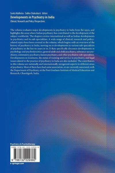 PART 1: The history of psychiatry in India.- Chapter 1. The beginnings of psychiatry in India.- PART 2: Developments in psychology and psychodynamics.- Chapter 2. Development of psychological testing in India.- Chapter 3. Psychometry as an adjunct to psychiatry: An Indian perspective.- Chapter 4. Cultural psychodynamics and the Indian personality.- PART 3: Developments in general adult psychiatry.- Chapter 5. Psychiatric nosology, its philosophy and science.- Chapter 6. Indian research on schizophrenia Title in Chapter & CTP is "Schizophrenia: Indian Research".- Chapter 7. Research on acute and transient psychosis: An overview.- Chapter 8. Suicide studies in India.- Chapter 9. Common mental disorders in India.- Chapter 10. Early intervention in the Indian context.- PART 4: Developments in child psychiatry.- Chapter 11. Child psychiatry research and the Indian scene.- Chapter 12. Nosology and diagnostic issues in child and adolescent psychiatry.- Chapter 13. Intellectual disability in India.- Chapter 14. Autism spectrum disorder: Seventy years on and the plot thickens.- Chapter 15. Adolescent psychiatry: An overview of the Indian research.- Chapter 16. Perspectives on interventions in child psychiatry in India.- PART 5: Developments in substance use psychiatry.- Chapter 17. Addiction research in India.- Chapter 18. De-addiction services in India.- PART 6: Developments in community psychiatry.- Chapter 19. From institutions, to clinics to community: The development of community mental health research in India.- Chapter 20. Psychiatry in primary health care: Indian perspectives.- PART 7: Developments in liaison psychiatry.- Chapter 21. Psycho-oncology: Indian experiences and research.- Chapter 22. Delirium research in India.- PART 8: Developments in other psychiatric specialities.- Chapter 23. Geriatric psychiatry in India: Developments and future directions.- Chapter 24. A perspective on marital and psychosexual disorders in India.- PART 9: Developments in treatment.- Chapter 25. Electro-convulsive therapy: Research from India.- Chapter 26. Newer somatic treatments: Indian experience.- Chapter 27. Psychosocial interventions: An Indian perspective.- Chapter 28. Rehabilitation psychiatry.- PART 10: Developments in legal and educational aspects.- Chapter 29. Challenges in undergraduate psychiatric training in India.- Chapter 30. The Mental Health Act of India.- Reminiscences.