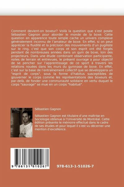 Comment devient-on boxeur? Voilà la question que s est posée Sébastien Gagnon pour aborder le monde de la boxe. Cette question en apparence toute simple cache un univers complexe généralement inconnu de l amateur de boxe. En effet, si on peut apprécier la fluidité et la précision des mouvements d un pugiliste sur le ring, c est que son corps et son esprit ont été forgés pendant de nombreuses années dans un gym de boxe, loin des projecteurs. Dans une étude combinant observation participante, notes de terrain et entrevues, le présent ouvrage a pour objectif de se pencher sur l apprentissage de ce sport à travers les relations nouées dans les murs du gymnase de boxe. En effet, c est sur la base de l entraînement collectif que se développera un "esprit de corps", sous la forme d habitus susceptibles de gouverner le corps comme les représentations des boxeurs et, par-delà, de fonder une communauté solidaire en vertu duquel le corps "sauvage" se mue en un corps "habitué".
