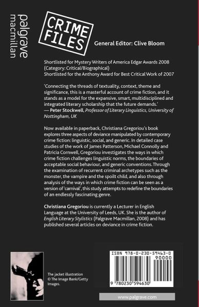 CHRISTIANA GREGORIOU is currently a Lecturer in English Language at the University of Leeds, UK. She is the author of English Literary Stylistics (Palgrave Macmillan, 2008) and has published several articles on deviance in crime fiction.