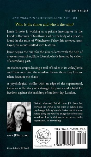 Who is the sinner and who is the saint? Jamie Brooke is working as a private investigator in the London Borough of Southwark when the body of a priest is found in the ruins of Winchester Palace, his tattooed arms flayed, his mouth stuffed with feathers. Jamie begins the hunt for the skin collector with the help of museum researcher, Blake Daniel, who is haunted by visions of a terrifying past. As violence erupts, leaving a trail of bodies in its wake, Jamie and Blake must find the murderer before those they love are taken down in the chaos. A psychological thriller with an edge of the supernatural, Deviance is the story of a struggle for power and a fight for freedom against the backdrop of modern-day London. The Brooke and Daniel Psychological Thrillers:Desecration #1 Delirium #2 Deviance #3