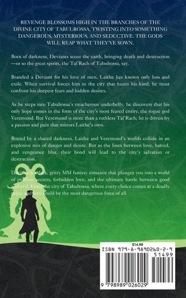 Revenge blossoms high in the branches of the divine city of Tabulrossa, twisting into something dangerous, mysterious, and seductive. The gods will reap what they've sown. Born of darkness, Deviants scour the earth, bringing death and destruction-or so the great spirits, the Tal'Rach of Tabulrossa, say. Branded a Deviant for his love of men, Laithe has known only loss and exile. When survival forces him to the city that hunts his kind, he must confront his deepest fears and hidden desires. As he steps into Tabulrossa's treacherous underbelly, he discovers that his only hope comes in the form of the city's most feared entity, the rogue god Veremund. But Veremund is more than a ruthless Tal'Rach; he is driven by a passion and pain that mirrors Laithe's own. Bound by a shared darkness, Laithe and Veremund's worlds collide in an explosive mix of danger and desire. But as the lines between love, hatred, and vengeance blur, their bond will lead to the city's salvation or destruction. Deviant is a dark, gritty MM fantasy romance that plunges you into a world of perilous secrets, forbidden love, and the ultimate battle between good and evil. Enter the city of Tabulrossa, where every choice comes at a deadly price, and love could be the most dangerous force of all.