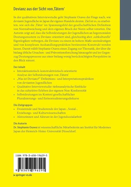 In der qualitativen Interviewstudie geht Stephanie Osawa der Frage nach, wie deviante Jugendliche in Japan ihr eigenes Handeln deuten. Ziel ist es, zu erarbeiten, wie sich die 'Täter' im Spannungsfeld der gesellschaftlichen Definition von Normabweichung und dem eigenen Bruch der Norm selbst verorten. Die Autorin zeigt auf, dass die Selbstdeutungen der Jugendlichen an hegemonialen Deutungsmustern zu Devianz orientiert sind, gleichzeitig aber 'subkulturelle' Eigenlogiken verbergen, die Devianz zu einem in hohem Maße uneindeutigen und von komplexen Aushandlungspraktiken bestimmten Konstrukt werden lassen. Damit wählt Stephanie Osawa einen Zugang zur Thematik, der über die bislang übliche Ursachen- und Präventionsforschung hinausgeht und im Gegenzug Deutungsprozesse aus einer bislang wenig berücksichtigten Perspektive in den Blick nimmt.