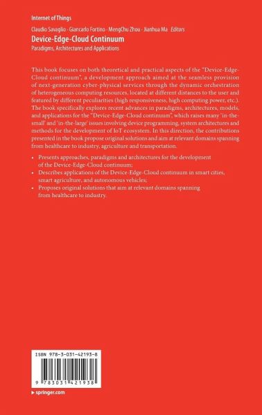 This book focuses on both theoretical and practical aspects of the "Device-Edge-Cloud continuum", a development approach aimed at the seamless provision of next-generation cyber-physical services through the dynamic orchestration of heterogeneous computing resources, located at different distances to the user and featured by different peculiarities (high responsiveness, high computing power, etc.). The book specifically explores recent advances in paradigms, architectures, models, and applications for the "Device-Edge-Cloud continuum", which raises many 'in-the-small' and 'in-the-large' issues involving device programming, system architectures and methods for the development of IoT ecosystem. In this direction, the contributions presented in the book propose original solutions and aim at relevant domains spanning from healthcare to industry, agriculture and transportation.