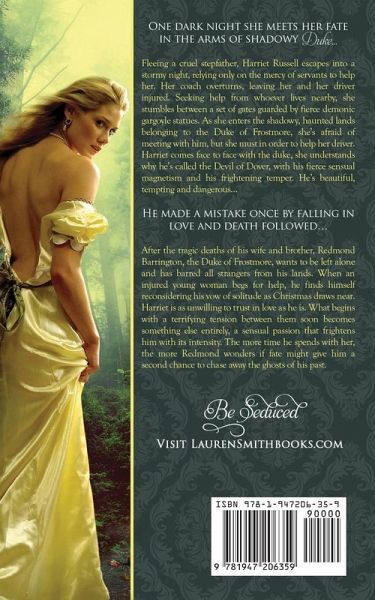 One dark night she meets her fate in the arms of shadowy duke… Fleeing a cruel stepfather, Harriet Russell escapes into a stormy night, relying only on the mercy of servants to help her. Her coach overturns, leaving her and her driver injured. Seeking help from whoever lives nearby, she stumbles between a set of gates guarded by fierce demonic gargoyle statues. As she enters the shadowy, haunted lands belonging to the Duke of Frostmore, she’s afraid of meeting with him, but she must in order to help her driver. When Harriet comes face to face with the duke, she understands why he’s called the Devil of Dover, with his fierce sensual magnetism and his frightening temper. He’s beautiful, tempting and dangerous… He made a mistake once by falling in love and death followed… After the tragic deaths of his wife and brother, Redmond Barrington, the Duke of Frostmore, wants to be left alone and has barred all strangers from his lands. When an injured young woman begs for help, he finds himself reconsidering his vow of solitude as Christmas draws near. Harriet is as unwilling to trust in love as he is. What begins with a terrifying tension between them soon becomes something else entirely, a sensual passion that frightens him with its intensity. The more time he spends with her, the more Redmond wonders if fate might give him a second chance to chase away the ghosts of his past.