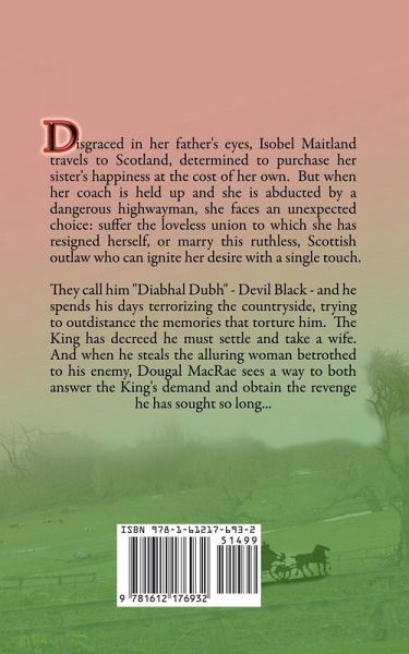 Disgraced in her father's eyes, Isobel Maitland travels to Scotland, determined to purchase her sister's happiness at the cost of her own. But when her coach is held up and she is abducted by a dangerous highwayman, she faces an unexpected choice: suffer the loveless union to which she has resigned herself, or marry this ruthless, Scottish outlaw who can ignite her desire with a single touch. They call him "Diabhal Dubh" - Devil Black - and he spends his days terrorizing the countryside, trying to outdistance the memories that torture him. The King has decreed he must settle and take a wife. And when he steals the alluring woman betrothed to his enemy, Dougal MacRae sees a way to both answer the King's demand and obtain the revenge he has sought so long...