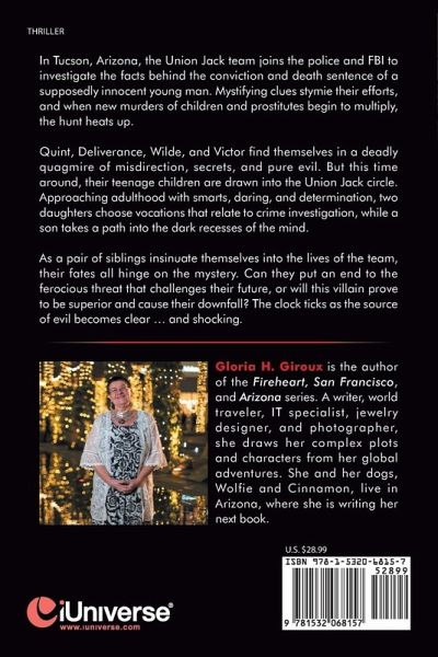In Tucson, Arizona, the Union Jack team joins the police and FBI to investigate the facts behind the conviction and death sentence of a supposedly innocent young man. Mystifying clues stymie their efforts, and when new murders of children and prostitutes begin to multiply, the hunt heats up. Quint, Deliverance, Wilde, and Victor find themselves in a deadly quagmire of misdirection, secrets, and pure evil. But this time around, their teenage children are drawn into the Union Jack circle. Approaching adulthood with smarts, daring, and determination, two daughters choose vocations that relate to crime investigation, while a son takes a path into the dark recesses of the mind. As a pair of siblings insinuate themselves into the lives of the team, their fates all hinge on the mystery. Can they put an end to the ferocious threat that challenges their future, or will this villain prove to be superior and cause their downfall? The clock ticks as the source of evil becomes clear ... and shocking.