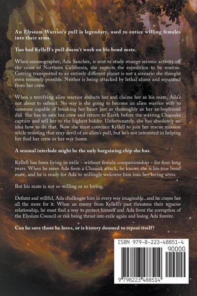 An Elysium Warrior's pull is legendary, used to entice willing females into their arms. Too bad Kyllell's pull doesn't work on his bond mate. When oceanographer, Ada Sanchez, is sent to study strange seismic activity off the coast of Northern California, she expects the expedition to be routine. Getting transported to an entirely different planet is not a scenario she thought even remotely possible. Neither is being attacked by lethal aliens and separated from her crew. When a terrifying alien warrior abducts her and claims her as his mate, Ada's not about to submit. No way is she going to become an alien warrior wife to someone capable of breaking her heart just as thoroughly as her ex-boyfriend did. She has to save her crew and return to Earth before the warring Chassaks capture and sell her to the highest bidder. Unfortunately, she has absolutely no idea how to do that. Now she must convince Kyllell to join her rescue mission while resisting that sexy devil of an alien's pull, but he's not interested in helping her find her crew or her way home. A sensual interlude might be the only bargaining chip she has. Kyllell has been living in exile - without female companionship - for four long years. When he saves Ada from a Chassak attack, he knows she is his true bond mate, and he is ready for Ada to willingly welcome him into her loving arms. But his mate is not so willing or so loving. Defiant and willful, Ada challenges him in every way imaginable...and he craves her all the more for it. When an enemy from Kyllell's past threatens their tenuous relationship, he must find a way to protect himself and Ada from the corruption of the Elysium Council or risk being thrust into exile again and losing Ada forever. Can he save those he loves, or is history doomed to repeat itself? The Warriors of Elysius Series contains standalone romance books with no cliffhangers, no cheating, and a guaranteed HEA. If you love alien abduction romance series, fated mates romances, dark warriors, feisty females, and hot, steamy love scenes, then this sci-fi alien mates romance novel was written especially for you. Steam alert: contains a hot alien alpha male who dominates in the bedroom and a curvy, strong-willed human female who refuses to submit. Strong sexual themes/language is present. Perfect for fans of Zoey Draven, Cara Bristol, and Evangeline Anderson. This is recommended for mature audiences only. Full-length 90,000+ word Sci-Fi Romance novel.