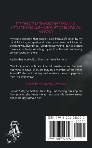 It's the little things that break us. Little things like a droplet of blood on my foot. My world ended in that droplet, bled from a life taken by my hand. It broke, fell apart, and never quite came back together the right way. Ever since, I've done everything I can to protect those around me, distracting myself from the real problem by concentrating on theirs. A plan that worked just fine, until I met Ramona. One look, one touch, and I could breathe again. But she's not mine to have. She's old lady to a member of the Fallen Aces MC. And not just any brother-he's the most psychotic man I've ever known. I want her. I have to have her. Foolish? Maybe. Selfish? Definitely. But nothing can stop me from proving she needs me as much as it kills me to wake up one more day without her.
