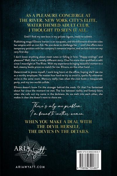 As a pleasure concierge at The River, New York City's elite, water-themed adult club, I thought I'd seen it all. Until I find my new boss in my private lagoon, ready to submit. Publishing mogul Elinora Iverson is an ice queen, and the billionaire divorcee rules her empire with an iron fist. No one dares to challenge her - until she offers me a temporary position with her company's romance imprint, and we lock horns on my very first day. I don't know anything about meet cutes or falling in love. "Happy endings" and pleasure? Well, that's a totally different story. One I'm more than qualified to edit since I moonlight at The River. With my experience bringing beautiful women to a boil, steamy books prove no match for me. Elinora, on the other hand . . . Determined to prove myself, I work long hours at the office, hoping she'll see me as a worthy employee. No matter how hard we try to avoid it, sparks fly whenever we're in the same room. Mercury really rises when the club hosts a masquerade party, and my two worlds collide. Elinora doesn't know I'm the stranger behind the mask. Or that I've fantasized about her since the moment we met. The line between reality and fantasy blurs when she calls out my name in the darkness. As we melt into each other, she makes it clear she doesn't want to share me. There's only one problem: I'm bound to another woman. When you make a deal with the Devil herself, the Devil's in the details. ¿AUTHOR'S NOTE: This book contains topics that might be sensitive for some readers. Please review the content advisories on the author's website.