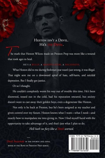 The mark that Heston Wilcox made on Preston Prep was more like a wound that took ages to heal. He's a bully. A manipulator. A sociopath. Heston isn't a Devil. He's the Devil. What Heston did to me during freshman year wasn't just wrong, it was illegal. That night sent me on a downward spiral of hate, self-harm, and suicidal depression. But I finally got justice. Or so I thought. He couldn't completely worm his way out of trouble this time. He's been disowned, tossed out in the cold, had his reputation smeared, but society doesn't want to cast away their golden boys, even a degenerate like Heston. Not only is he back at Preston, but he's been assigned as my teacher and given control over my future. Heston knows what I want-what I need-and exactly how to manipulate me into giving in. Now I find myself faced with the opportunity to take advantage of it, and that's just what I plan to do. Hell Hath No Fury Like a Devil Scorned.
