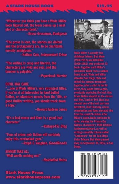 DEVIL MAY CARE Biggo Venn doesn't want to admit it but he's getting too old for the mercenary soldier routine. Still, when an old friend comes to him with a small job down in Mexico that's got an easy $20,000 payoff, he agrees to make the contact. Seems simple enough. But the small town of Ensenada is a lot more treacherous than he bargains for. First there's Jinny, the deceitful blonde with an itch for his traveling cash; Len Hardesty, a long-time rival and soldier for hire who just happens to appear whenever he's least wanted; and Pabla, the sweetest vision he can imagine, and possibly the most dangerous. When the bodies start piling up, Biggo knows he's in for the fight of his life. SINNER TAKE ALL They want him dead. General Gayoso knows that the only way to assassinate Bruno Lazar is to get the reclusive rebel out in the open. So he has Lazar's best friend poisoned, and hires Jack Cox, a down-at-heel American sharpshooter, to plan Lazar's murder at the funeral they know he will attend. The plan is brilliant in its simplicity. But it doesn't take into account the mixed emotions of Lazar's protégé, Dorlisa Von Ritter, who precedes him to Tijuana to make sure the way is safe. Nor does it take into account Cox's fatal sense of conscience. Gayoso is not a man to be thwarted, but even he cannot know what will happen when the assassin and the protégé fall in love.