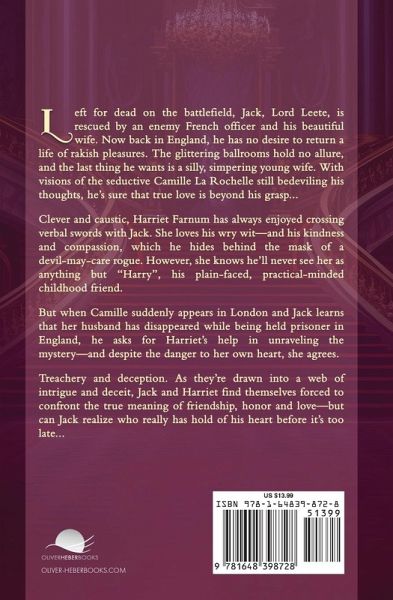 Left for dead on the battlefield, Jack, Lord Leete, is rescued by an enemy French officer and his beautiful wife. Now back in England, he has no desire to return a life of rakish pleasures. The glittering ballrooms hold no allure, and the last thing he wants is a silly, simpering young wife. With visions of the seductive Camille La Rochelle still bedeviling his thoughts, he's sure that true love is beyond his grasp... Clever and caustic, Harriet Farnum has always enjoyed crossing verbal swords with Jack. She loves his wry wit-and his kindness and compassion, which he hides behind the mask of a devil-may-care rogue. However, she knows he'll never see her as anything but "Harry", his plain-faced, practical-minded childhood friend. But when Camille suddenly appears in London and Jack learns that her husband has disappeared while being held prisoner in England, he asks for Harriet's help in unraveling the mystery-and despite the danger to her own heart, she agrees. Treachery and deception. As they're drawn into a web of intrigue and deceit, Jack and Harriet find themselves forced to confront the true meaning of friendship, honor and love-but can Jack realize who really has hold of his heart before it's too late...