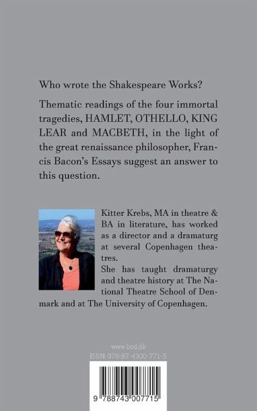 Who wrote the Shakespeare Works?Thematic readings of the four immortal tragedies, HAMLET, OTHELLO, KING LEAR and MACBETH, in the light of the great renaissance philosopher, Francis Bacon's Essays suggest an answer to this questinon.
