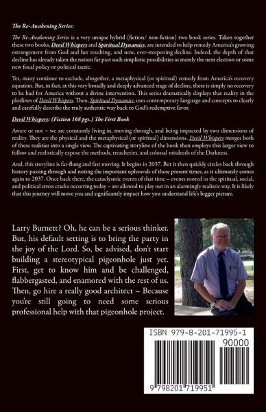 The Re-Awakening Series: A unique, hybrid (fiction / non-fiction) 2 book set What will happen if these two books are read in their correct order? Well first, Devil Whispers will paint a succinct and vibrant picture of the human experience in both the physical and spiritual dimensions - simultaneously. And, in doing so, the book will easily transport the reader past the belief that human events are merely the product of a physical, cause-and-effect process. Indeed, this book will clearly show that the unseen dynamics of the spiritual dimension are the much more culpable animators of our days. This frank and challenging book is actually intended to do two primary things. It is intended to freshly awaken a sense of positive desperation in godly hearts - a desperation which, in turn, energizes new levels of devotion, understanding, and intimacy with God. And, it is intended to set the stage for the completing book in this set, Spiritual Dynamics. That book then pierces the religious gobbledygook and theological misdirections to reveal a clear view of that authentic redemptive journey which always attends true faith. The world is now living through a late and difficult hour in God's redemptive time-table - one in which America is actually imploding before our eyes. Most still lay the blame for this on our dire political realities. But here too, the more foundational cause lies within those unseen dynamics of the spiritual dimension. We are really failing because our populace, both religious and secular, has alienated God by our now widespread shallowness and disrespect. As a result, He has taken a decisive back-step. And now, absent God's active national guardianship, we are left staring at imminent collapse. These books were written to help avert that terminal anguish. And, they have a real capacity to make a difference - if allowed to speak. Devil Whispers: (Fiction 165 pgs.) The First Book Aware or not - we are constantly living in, moving through, and being impacted by two dimensions of reality. They are the physical and the metaphysical (or spiritual) dimensions. Devil Whispers merges both of these realities into a single view. The captivating storyline of the book then employs this larger view to follow and realistically expose the methods, treacheries, and colossal misdeeds of the Darkness. And, this storyline is far-flung and fast moving. It begins in 2037. But it then quickly circles back through history passing through and noting the important upheavals of these present times, as it ultimately comes again to 2037. Once back there, the cataclysmic events of that time - events rooted in the spiritual, social, and political stress cracks occurring today - are allowed to play out in an alarmingly realistic way. It is likely that this journey will move you and significantly impact how you understand life's bigger picture.