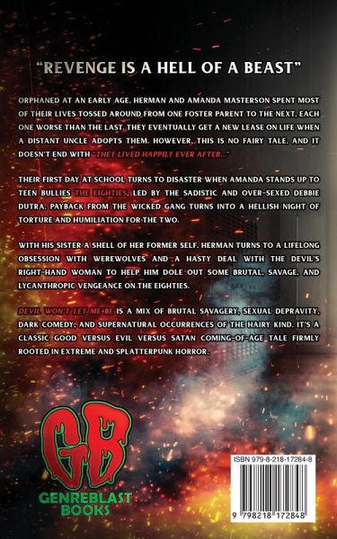WARNING: This book contains graphic depictions of sex and violence. "Revenge is a Hell of a Beast" Orphaned at an early age, Herman and Amanda Masterson spent most of their lives tossed around from one foster parent to the next, each one worse than the last. They eventually get a new lease on life when a distant uncle adopts them. However, this is no fairy tale, and it doesn't end with "they lived happily ever after..." Their first day at school turns to disaster when Amanda stands up to teen bullies The Eighties, led by the sadistic and over-sexed Debbie Dutra. Payback from the wicked gang turns into a hellish night of torture and humiliation for the two. With his sister a shell of her former self, Herman turns to a lifelong obsession with werewolves and a hasty deal with the Devil's right-hand woman to help him dole out some brutal, savage, and lycanthropic vengeance on The Eighties. Devil Won't Let Me Be is a mix of brutal savagery, sexual depravity, dark comedy, and supernatural occurrences of the hairy kind. It's a classic good versus evil versus Satan coming-of-age tale firmly rooted in extreme and splatterpunk horror.