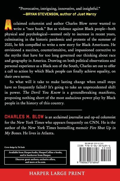 INSTANT NEW YORK TIMES BESTSELLER A New York Times Editor's Choice A Kirkus Best Nonfiction Book of the Year From journalist and New York Times bestselling author Charles Blow comes a powerful manifesto and call to action, "a must-read in the effort to dismantle deep-seated poisons of systemic racism and white supremacy" (San Francisco Chronicle). Race, as we have come to understand it, is a fiction; but, racism, as we have come to live it, is a fact. The point here is not to impose a new racial hierarchy, but to remove an existing one. After centuries of waiting for white majorities to overturn white supremacy, it seems to me that it has fallen to Black people to do it themselves. Acclaimed columnist and author Charles Blow never wanted to write a ?race book.? But as violence against Black people?both physical and psychological?seemed only to increase in recent years, culminating in the historic pandemic and protests of the summer of 2020, he felt compelled to write a new story for Black Americans. He envisioned a succinct, counterintuitive, and impassioned corrective to the myths that have for too long governed our thinking about race and geography in America. Drawing on both political observations and personal experience as a Black son of the South, Charles set out to offer a call to action by which Black people can finally achieve equality, on their own terms. So what will it take to make lasting change when small steps have so frequently failed? It's going to take an unprecedented shift in power. The Devil You Know is a groundbreaking manifesto, proposing nothing short of the most audacious power play by Black people in the history of this country. This book is a grand exhortation to generations of a people, offering a road map to true and lasting freedom.