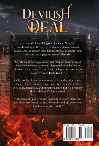 Last month, I was living out of my car. Now, I'm couch-surfing in Brooklyn. It's about as glamorous as it sounds. All I've got are some bad memories, an empty bank account, and a pigeon I named Hendrix. So, when a mysterious, sinfully hot man offers me a deal, I have no choice but to accept. I'll pretend to be his live-in girlfriend for a month. In exchange, he'll give me a job at his exclusive club in Hell's Kitchen. Only problem is, there's way more to Asmodeus than meets the eye. He's a literal demon. Like, from the underworld. He's rude, dangerous, and probably a killer. But if I break my deal with him, I'll lose my soul. Fortunately, it's just a month. A month of heated stares and fake kisses that feel all too real. My soul-and my body-can totally survive this...right?