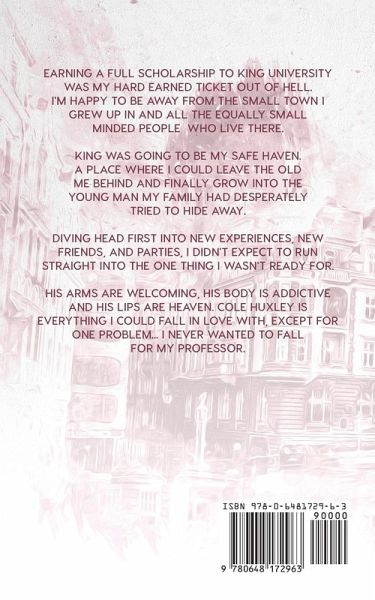Earning a full scholarship to King University was my hard earned ticket out of hell. I'm happy to be away from the small town I grew up in and all the equally small minded people who live there. King was going to be my safe haven. A place where I could leave the old me behind and finally grow into the young man my family had desperately tried to hide away. Diving head first into new experiences, new friends, and parties, I didn't expect to run straight into the one thing I wasn't ready for. ¿His arms are welcoming, his body is addictive and his lips are heaven. Cole Huxley is everything I could fall in love with, except for one problem... I never wanted to fall for my professor.