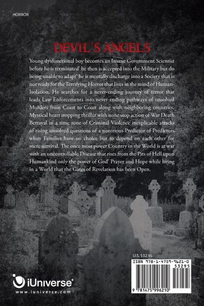 Young dysfunctional boy becomes an Insane Government Scientist before he is terminated' he then is accepted into the Military but do being unable to adapt' he is mentally discharge into a Society that is not ready for the Terrifying Horror that lives in the mind of Human-Isolation. He searches for a never-ending journey of terror that leads Law Enforcements into never ending pathways of unsolved Murders from Coast to Coast along with neighboring countries. Mystical heart stopping thriller with none stop action of War Death Betrayal in a time zone of Criminal Violence inexplicable attacks of rising unsolved questions of a notorious Predictor of Predictors when Families have no choice but to depend on each other for mere survival. The once most power Country in the World is at war with an uncontrollable Disease that rises from the Pits of Hell upon Humankind only the power of God' Prayer and Hope while living in a World that the Gates of Revelation has been Open.
