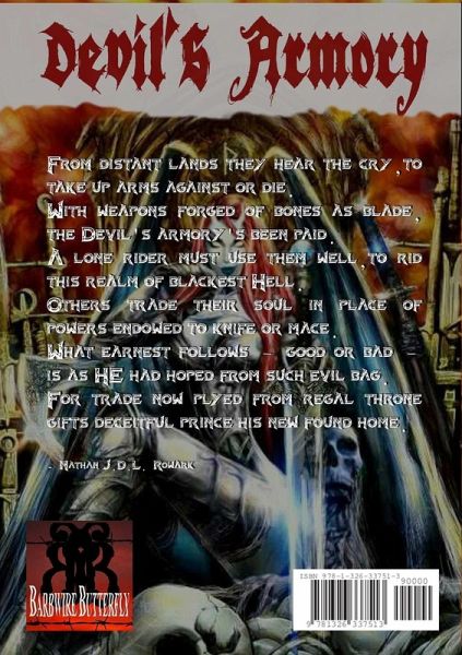 From distant lands they hear the cry, to take up arms against or die. With weapons forged of bones as blade, the Devil's armory's been paid. A lone rider must use them well, to rid this realm of blackest Hell. Others trade their soul in place of powers endowed to knife or mace. What earnest follows - good or bad - is as HE had hoped from such evil bag. For trade now plyed from regal throne gifts deceitful prince his new-found home. - Nathan J.D.L. Rowark Join the authors of Barbwire Butterfly Books for high adventure tales from long lost realms, in an anthology of sword and sorcery forged from the Devil's armory.