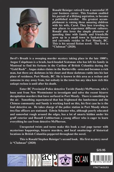 Devil's Breath is a sweeping murder mystery taking place in the late 1800's. Angus Colquhoon is a brash, hard-headed Scotsman who has left his family in Montreal to find his fortune in the Caribou of British Columbia during the "Gold Rush" . Angus stakes claims in the Barkerville -area and becomes a rich man, but there are skeletons in his closet and those skeletons rattle into his last place of residence, Port Moody, BC. He is known in this area as a recluse and someone to stay away from, but nobody in the town has any idea how rich this unkept recluse is until after his death. Enter BC Provincial Police detective Tavish (Sandy)MacPherson, who is sent from New Westminster to investigate and solve the recent bizarre decapitation murders that have surfaced in Port Moody. There is something in the air. Something supernatural that has frightened the lumbermen and the Chinese community and Sandy is working hard on this his first case he is the lead detective on. He takes charge of the police station in Port Moody where two fine officers are stationed. Edwin Shuster, a dyed in the wool Scotsman somewhat rough around the edges but with a lot of smarts under his gruff exterior and Russell Cuthbertson a young officer who is eager to learn everything he can from detective MacPherson. Unexpected twists and turns make this book a real page turner with mysterious happenings, bizarre murders, and local smatterings of historical locations in British Columbia peppered throughout the novel. This is Ronald Stephen Reiniger's second book. His first mystery novel is "Clubman" (2020)