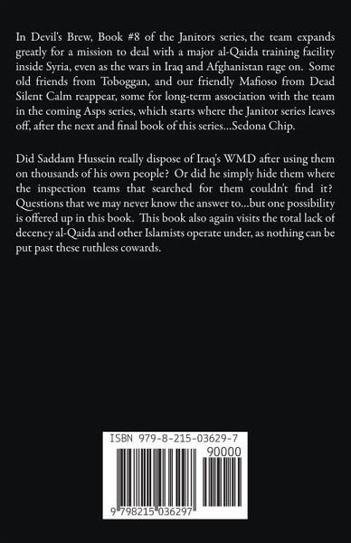 In Devil's Brew, Book #8 of the Janitors series, the team expands greatly for a mission to deal with a major al-Qaida training facility inside Syria, even as the wars in Iraq and Afghanistan rage on. Some old friends from Toboggan, and our friendly Mafioso from Dead Silent Calm reappear, some for long-term association with the team in the coming Asps series, which starts where the Janitor series leaves off, after the next and final book of this series…Sedona Chip. Did Saddam Hussein really dispose of Iraq's WMD after using them on thousands of his own people? Or did he simply hide them where the inspection teams that searched for them couldn't find it? Questions that we may never know the answer to…but one possibility is offered up in this book. This book also again visits the total lack of decency al-Qaida and other Islamists operate under, as nothing can be put past these ruthless cowards.