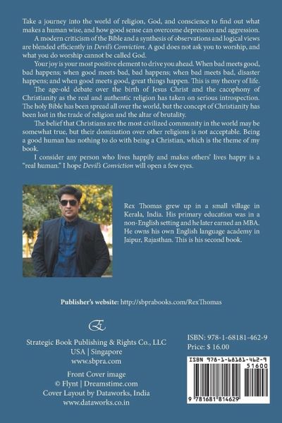 Take a journey into the world of religion, God, and conscience to find out what makes a human wise, and how good sense can overcome depression and aggression. A modern criticism of the Bible and a synthesis of observations and logical views are blended efficiently in Devil’s Conviction. A god does not ask you to worship, and what you do worship cannot be called God. Your joy is your most positive element to drive you ahead. When bad meets good, bad happens; when good meets bad, bad happens; when bad meets bad, disaster happens; and when good meets good, great things happen. This is my theory of life. The age-old debate over the birth of Jesus Christ and the cacophony of Christianity as the real and authentic religion has taken on serious introspection. The holy Bible has been spread all over the world, but the concept of Christianity has been lost in the trade of religion and the altar of brutality. The belief that Christians are the most civilized community in the world may be somewhat true, but their domination over other religions is not acceptable. Being a good human has nothing to do with being a Christian, which is the theme of my book. I consider any person who lives happily and makes others’ lives happy is a "real human." I hope Devil’s Conviction will open a few eyes. Rex Thomas grew up in a small village in Kerala, India. His primary education was in a non-English setting and he later earned an MBA. He owns his own English language academy in Jaipur, Rajasthan. This is his second book. Publisher’s website: http://sbprabooks.com/RexThomas