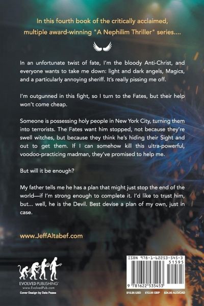 Steven Cabbott is running out of time to prevent the End of Days. "Devil's Day is a phenomenal supernatural novel, filled with action, drama, extraordinary characters, and a mesmerizing storyline. Mr. Altabef has created another brilliant masterpiece!" ~ Readers' Favorite Book Reviews, Susan Sewell (5 STARS) In an unfortunate twist of fate, Steven Cabbott is the bloody Anti-Christ, and everyone wants to take him down: light and dark angels, Magics, and a particularly annoying sheriff. It's really pissing him off, but he's outgunned in this fight, so he turns to the Fates, whose help won't come cheap. Steven's father tells him he has a plan that might just stop the end of the world-if Steven is strong enough to complete it. Steven would like to trust him, but... well, he is the Devil. Best devise a plan of his own, just in case. If you like Jim Butcher, Steve McHugh, Michael Anderle, Nazri Noor, Shayne Silvers, Shannon Mayer, or K.F. Breene, you won't be able to put down the "A Nephilim Thriller" series. EVOLVED PUBLISHING PRESENTS an intriguing, thrilling look inside a great battle between good and evil, possibly leading to the End of Days, with the fourth book in the multiple award-winning "A Nephilim Thriller" series. "Fast-paced and action-packed, Devil's Day is an absolutely brilliant novel that will keep you on the edge of your seat and wanting more. To say I loved this book is an understatement!" ~ Readers' Favorite Book Reviews, Rabia Tanveer (5 STARS) "Devil's Day is, for me, the best in this series and that's saying something. ... Another roller coaster ride, directed by Jeff Altabef, starring some of the most memorable characters you'll ever meet, in situations that will boggle your mind." ~ Readers' Favorite Book Reviews, Lex Allen (5 STARS)