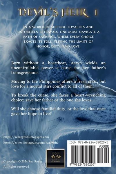 The Devil's Heir Series (Filipino, Tagalog Fiction New Story) Devil's Heir Book 1 Part One of the Series Aeryn was born without a heartbeat, yet she continues to live. She possesses a formidable power that no one can match, but struggles to control it, especially when her heart is still. This power is actually a curse, a punishment for her father's violation of a forbidden rule in their kingdom, which resulted in her mother's death. One day, her father determines to move to the Philippines, seeking a fresh start for both of them. There, Aeryn can attend a new school and immerse herself in an unfamiliar environment. In the Philippines, Aeryn meets a young man who will profoundly affect her life. However, she remains oblivious to the fact that her love for a mortal will ignite conflict for all involved. To break the curse, she must confront a painful decision; whether to save her father's life or choose the person she loves. This decision proves to be the most challenging and heart-wrenching she has ever faced. Genre: Fantasy Category: Young Adult (YA) Language: Taglish (Tagalog, English) Word Count: 48,961