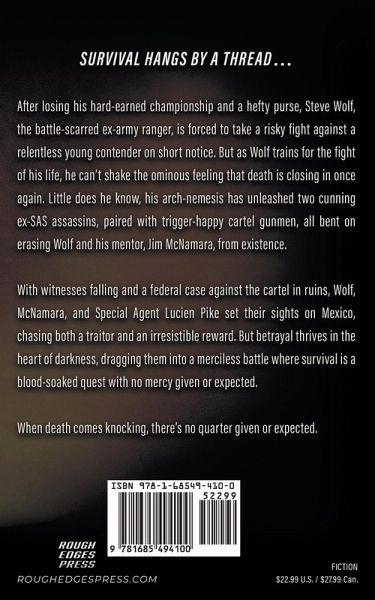 Survival hangs by a thread... After losing his hard-earned championship and a hefty purse, Steve Wolf, the battle-scarred ex-army ranger, is forced to take a risky fight against a relentless young contender on short notice. But as Wolf trains for the fight of his life, he can't shake the ominous feeling that death is closing in once again. Little does he know, his arch-nemesis has unleashed two cunning ex-SAS assassins, paired with trigger-happy cartel gunmen, all bent on erasing Wolf and his mentor, Jim McNamara, from existence. With witnesses falling and a federal case against the cartel in ruins, Wolf, McNamara, and Special Agent Lucien Pike set their sights on Mexico, chasing both a traitor and an irresistible reward. But betrayal thrives in the heart of darkness, dragging them into a merciless battle where survival is a blood-soaked quest with no mercy given or expected. When death comes knocking, there's no quarter given or expected.