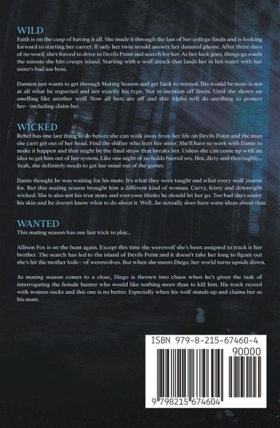All three books in the first season of the Devils Point Wolves! Fueled by desire, driven by need. This mating season won't go down easy. WILD Damien just wants to get through Mating Season and get back to normal. His would be mate is not at all what he expected and not exactly his type. Not to mention off limits. Until she shows up smelling like another wolf. Now all bets are off and this Alpha will do anything to protect her--including claim her. WICKED Dante thought he was waiting for his mate. It's what they were taught and what every wolf yearns for. But this mating season brought him a different kind of woman. Curvy, feisty and downright wicked. She is also not his true mate and everyone thinks he should let her go. Too bad she's under his skin and he doesn't know what to do about it. Well...he actually does have some ideas about that. WANTED As mating season comes to a close, Diego is thrown into chaos when he's given the task of interrogating the female hunter who would like nothing more than to kill him. His track record with women sucks and this one is no better. Especially when his wolf stands up and claims her as his mate.