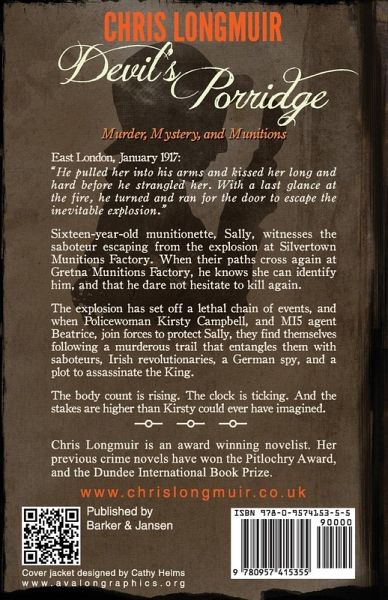 Murder, Mystery, and Munitions East London, January 1917: "He pulled her into his arms and kissed her long and hard before he strangled her. With a last glance at the fire, he turned and ran for the door to escape the inevitable explosion." Sixteen-year-old munitionette, Sally, witnesses the saboteur escaping from the explosion at Silvertown Munitions Factory. When their paths cross again at Gretna Munitions Factory, he knows she can identify him, and that he dare not hesitate to kill again. The explosion has set off a lethal chain of events, and when Policewoman Kirsty Campbell, and MI6 agent Beatrice, join forces to protect Sally, they find themselves following a murderous trail that entangles them with saboteurs, Irish revolutionaries, a German spy, and a plot to assassinate the King. The body count is rising. The clock is ticking. And the stakes are higher than Kirsty could ever have imagined. Chris Longmuir is an award-winning novelist as well as an established writer of short stories and articles. Night Watcher, the first book in the Dundee Crime Series, won the Scottish Association of Writers' Pitlochry Award, and the sequel, Dead Wood, won the Dundee International Book Prize, as well as the Pitlochry Award.