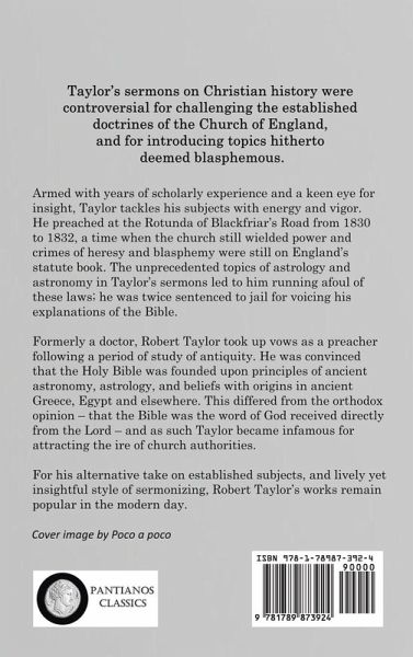 Taylor's sermons on Christian history were controversial for challenging the established doctrines of the Church of England, and for introducing topics hitherto deemed blasphemous. Armed with years of scholarly experience and a keen eye for insight, Taylor tackles his subjects with energy and vigor. He preached at the Rotunda of Blackfriar's Road from 1830 to 1832, a time when the church still wielded power and crimes of heresy and blasphemy were still on England's statute book. The unprecedented topics of astrology and astronomy in Taylor's sermons led to him running afoul of these laws; he was twice sentenced to jail for voicing his explanations of the Bible. Formerly a doctor, Robert Taylor took up vows as a preacher following a period of study of antiquity. He was convinced that the Holy Bible was founded upon principles of ancient astronomy, astrology, and beliefs with origins in ancient Greece, Egypt and elsewhere. This differed from the orthodox opinion - that the Bible was the word of God received directly from the Lord - and as such Taylor became infamous for attracting the ire of church authorities. For his alternative take on established subjects, and lively yet insightful style of sermonizing, Robert Taylor's works remain popular in the modern day.