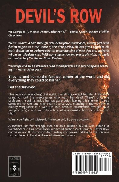 They hunted her to the furthest corner of the world and did everything they could to kill her. But she survived. Elisabeth lost everything that night. Everything except her life. A life she's using to hunt the mercenaries who want her dead. There's only one problem: the wolf inside her has gone quiet, leaving this she-wolf to rely solely on her wits and killer instinct to survive. Standing in the way of her bloody vengeance is a war-torn 18th century countryside ravaged by a vampiric plague and home to a host of unspeakable horrors stalking the night. When you fight evil with evil, there can only be one outcome... A shifter's lust for revenge puts her on a collision course with a band of witchfinders in this novel from acclaimed author Matt Serafini. Devil's Row combines occult horror and dark fantasy and places it all in the universe first explored in Feral: A Novel of Werewolf Horror.