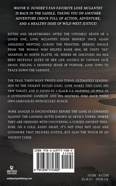 "Bitter and heartbroken after the untimely death of a loved one, Lone McGantry finds himself once again aimlessly drifting across the frontier. Seeking solace from the woman who helped raise him, he visits 'Ma' Sharples in North Platte, NE, where he discovers Ma has been recently jilted of her life savings by conman Jack Swain. Feeling a renewed sense of purpose, Lone vows to track down the varmint. The trail takes many twists and turns, ultimately leading him to the violent Eccles gang. Lone makes this gang his new target, and is joined by a black U.S. Marshal, as well as a gunslinging gambler and his mistress who have their own grievances with Eccles' bunch. More danger is encountered before the gang is cornered against the looming butte known as Devil's Tower, where they are obsessed with uncovering a cursed ancient treasure. On a cold, rainy night, it's not only hot lead and gunsmoke that delivers justice-- but also the touch of an ancient curse."--Publisher.