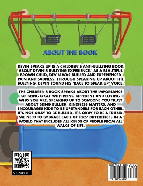 Devin Speaks Up! is a Children's Anti-Bullying Book about Devin's bullying experience. As a beautiful brown child, Devin was bullied and experienced pain and sadness. Through speaking up about the bullying, Devin found his 'Race To Speak Up' voice. The children's book speaks about the importance of being okay with being different and loving who you are, speaking up to someone you trust about being bullied, and that kindness matters. It's not okay to be bullied. It's okay to be a friend. The story encourages kids to speak up and be upstanders for each other. We need to embrace each others' differences in a world that includes all kinds of people from all walks of life.