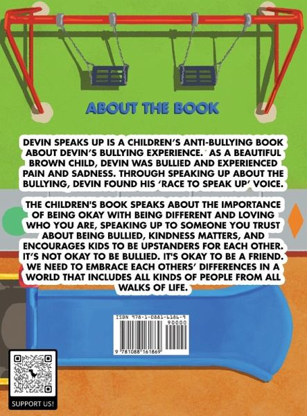 Devin Speaks Up! is a Children's Anti-Bullying Book about Devin's bullying experience. As a beautiful brown child, Devin was bullied and experienced pain and sadness. Through speaking up about the bullying, Devin found his 'Race To Speak Up' voice. The children's book speaks about the importance of being okay with being different and loving who you are, speaking up to someone you trust about being bullied, and that kindness matters. It's not okay to be bullied. It's okay to be a friend. The story encourages kids to speak up and be upstanders for each other. We need to embrace each others' differences in a world that includes all kinds of people from all walks of life. https://www.racetospeakup.com/shop