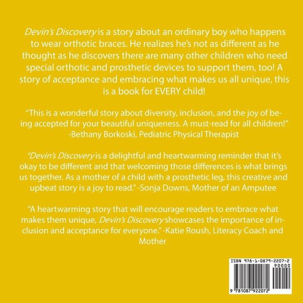 Devin's Discovery is a story about an ordinary boy who happens to wear orthotic braces. He realizes he's not as different as he thought as he discovers there are many other children who need special orthotics and prosthetics to support them, too! A story of acceptance and embracing what makes us all unique, this is a book for EVERY child! Devin and his three friends represent four unique ethnic backgrounds, which adds to the elements of diversity and inclusion already portrayed throughout the story. After enjoying a fun, rhyming story paired with colorful, eye-catching illustrations, readers can learn more about orthotic braces and prosthetics by viewing the informational section and photographs at the end of the book. If you've never heard of AFOs, SMOs, or prosthetic limbs, this part of the book will teach you all about these medical devices used by so many people to help them complete everyday activities!